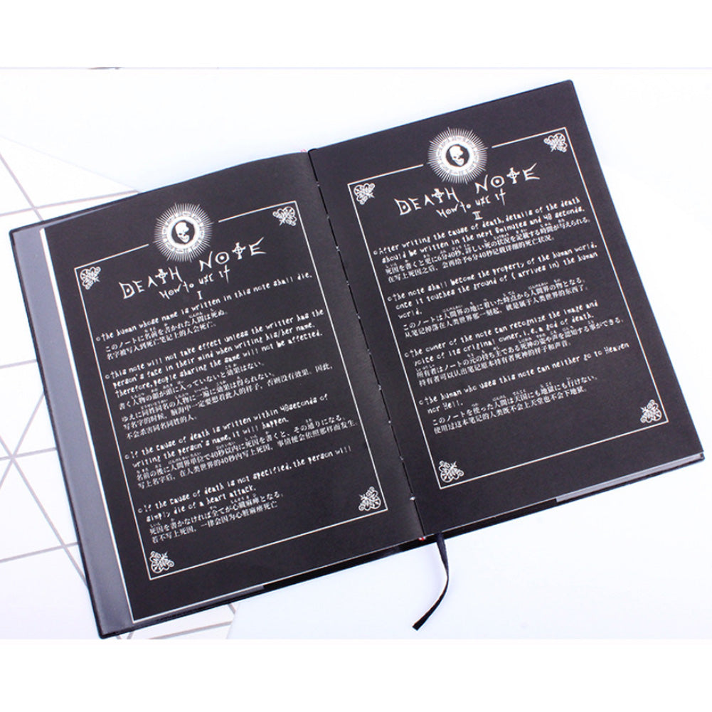 Take control of destiny with the legendary supernatural journal from the hit series Death Note. This replica notebook features the iconic "DEATH NOTE" lettering on a sleek black cover, faithfully recreating the look of Ryuk’s dropped treasure. The set includes a light blue feather quill pen, allowing you to write with the same dramatic flair as Light Yagami himself.